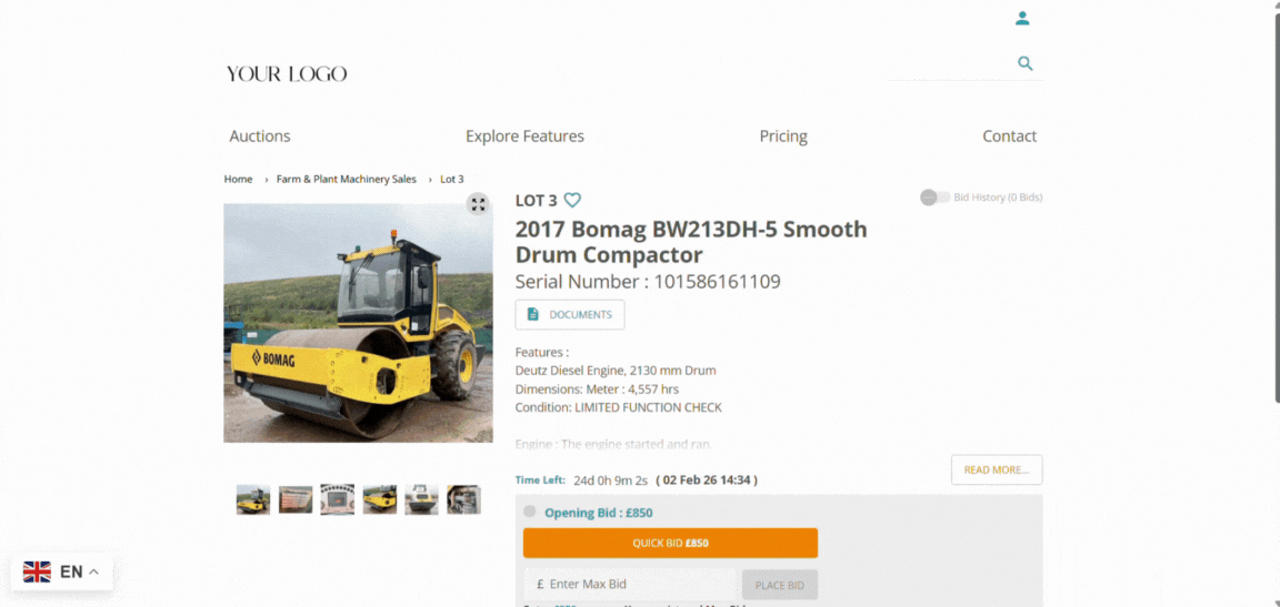 Professional auction software for high-value agricultural and industrial assets. Run secure, branded online auctions for machinery, equipment, and industrial assets — built for professional auctioneers who need control, clarity, and reliability.